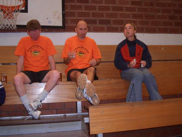Auch wenn unser erstes Spiel am Sonntagmorgen bereits für 9.00 Uhr angesetzt wurde, halb so schlimm, denn diese Nacht bescherte uns eine Stunde mehr. Demzufolge spielten wir doch erst 10.00 Uhr und waren fast ausgeschlafen! Wir konnten sogar zwei Siege für uns verbuchen (Grünstadt und Berlin- Mariendorf), was uns immerhin den 3. Platz in unserer Gruppe einbrachte. Im Platzierungsspiel standen wir den Berliner Bären gegenüber, und die gingen nicht gerade gemütlich mit uns um. So kam es, dass die Sanitäter ihre erste Chance an diesem Wochenende witterten, als Rainer unsanft auf dem Parkett landete und ihm sofort in geballter und vor allem gewichtiger Ladung zu Hilfe eilten. Kein Wunder, dass es Rainer angst und bange wurde und er vor der weißen Welle flüchten wollte. Doch die Sanitäter, froh, endlich zu ihrem Einsatz zu kommen, ließen ihr Opfer nicht so einfach gehen und liefen hinterher. Zum Glück mussten sie unverrichteter Dinge wieder von dannen ziehen.